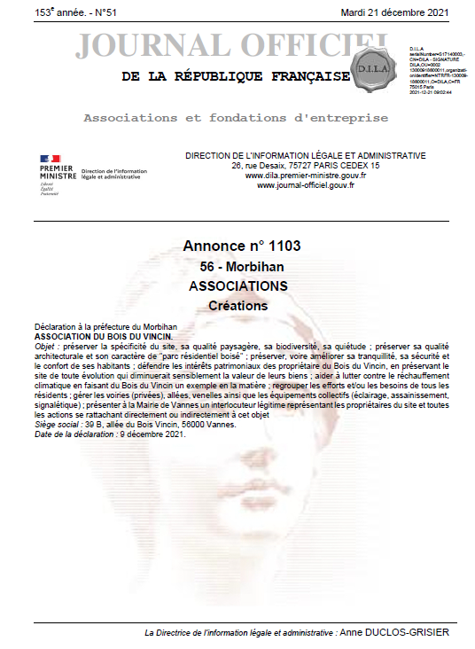 Avis de Constitution de l’Association du Bois du Vincin (Loi 1901)